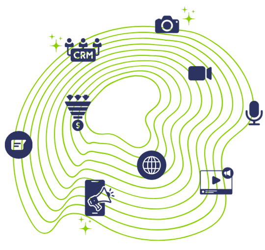 Te acompañamos desde la generación de contenido, fotografía, video, videopodcast hasta la ejecución de embudos de venta, sitios web, campañas Meta Ads y CRM.